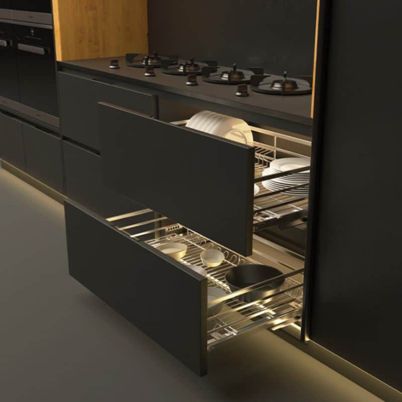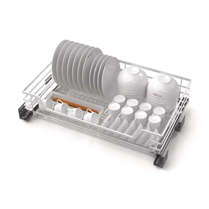 - Bộ rổ, bộ ray giảm chấn, khay hứng nước, 2 thanh đỡ khay, 2 bas mặt trước, 2 bas hậu cho ray trượt, 2 bas giữ ray, 12 ốc lắp đặt.