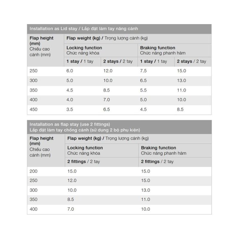 - Trọn bộ : 1 tay nâng, 1 bas gắn tủ, 1 bas bắt vít cho cánh