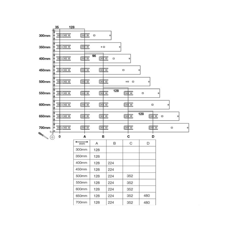 - Trọn bộ gồm : 1 cặp ray trượt, 2 vít bắt gỗ và 6 vít Euro
