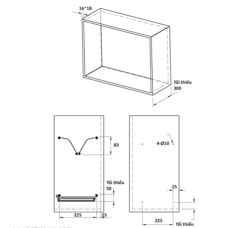 - Chiều sâu lọt lòng (S): Tối thiểu 300